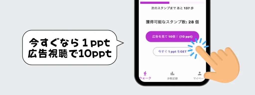 1 日にどれだけ歩くかによって獲得ポイントが変わりますが、広告を積極的に活用するとポイント効率が大きく上がります。